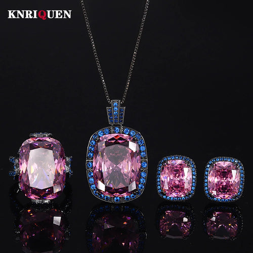 New Vintage Pink Quartz Ring Earrings Pendant Necklace for Women Gemstone Ruby Cocktail Party Fine Jewelry Set Anniversary Gift
